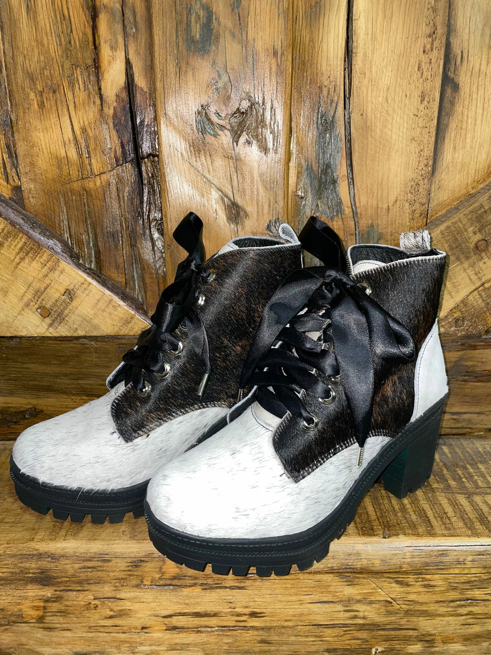 The Alondra Cowhide Combat Boot will instantly become your favorite pair and pictures DO NOT DO THEM JUSTICE! THEY ARE THE MOST GORGEOUS BOOTS! It’s a classic combat boot that has been reinvented with Alcala’s signature cowhide leather. Made of hair on leather, these cool combat boots have block heels for a little extra height. Â Not all cowhide is the same!
