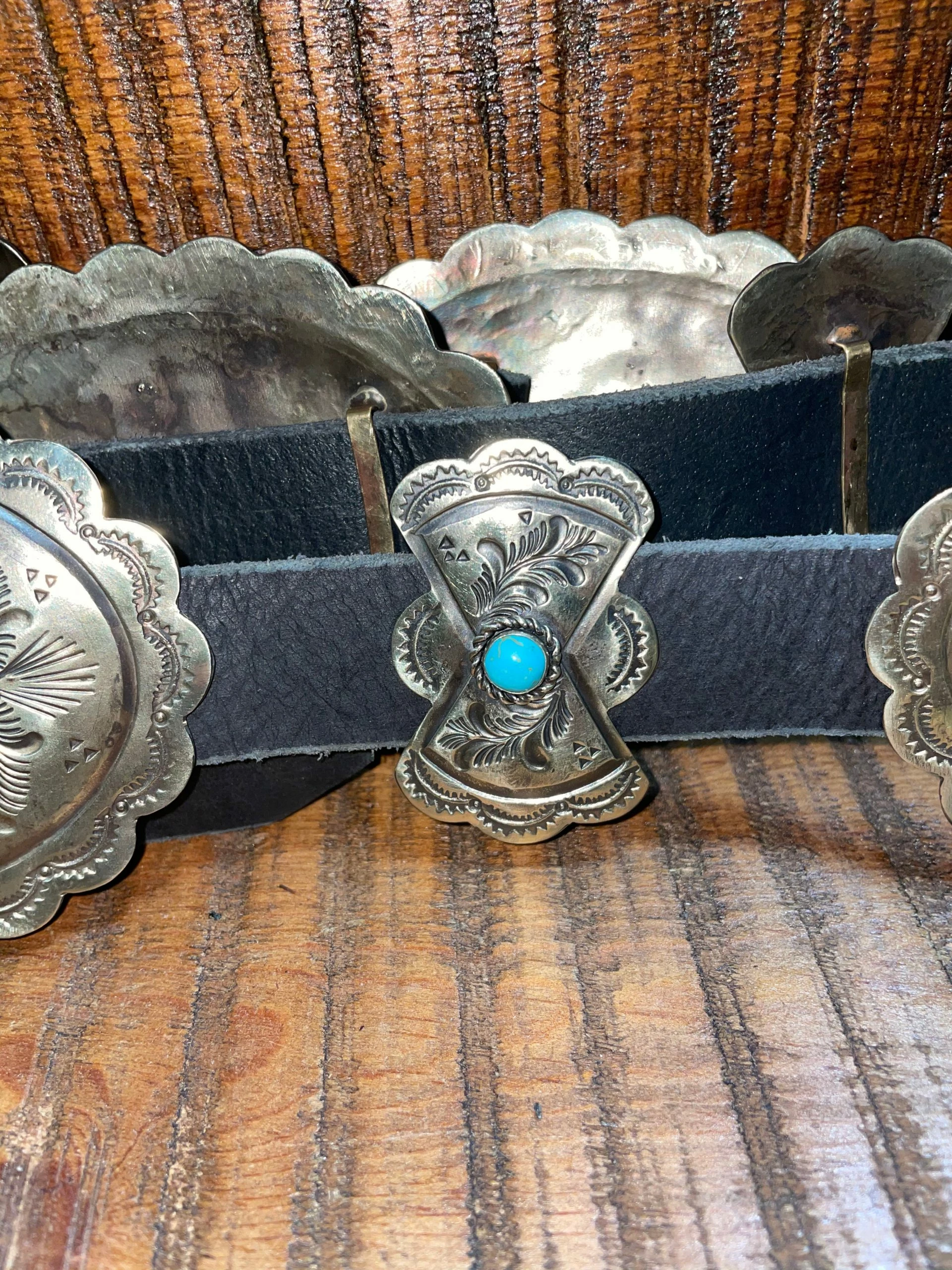 Oh my this German silver Guadalupe Woman concho belt by Barbosa is STUNNING, 12 conchos with the Guadalupe Woman conchos with its unique concho shape. They are on a black or brown leather belt.Â