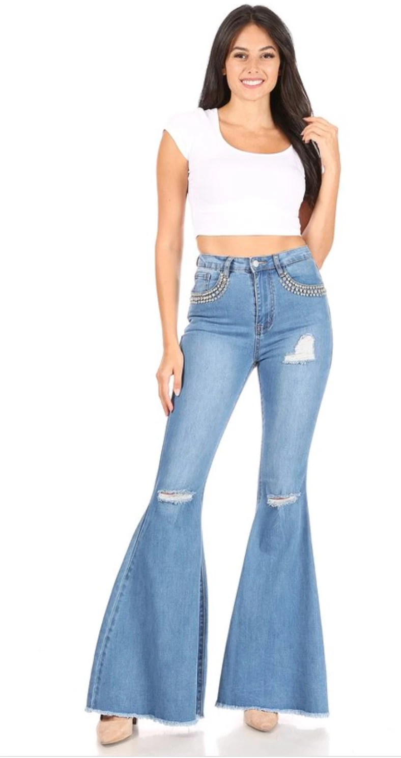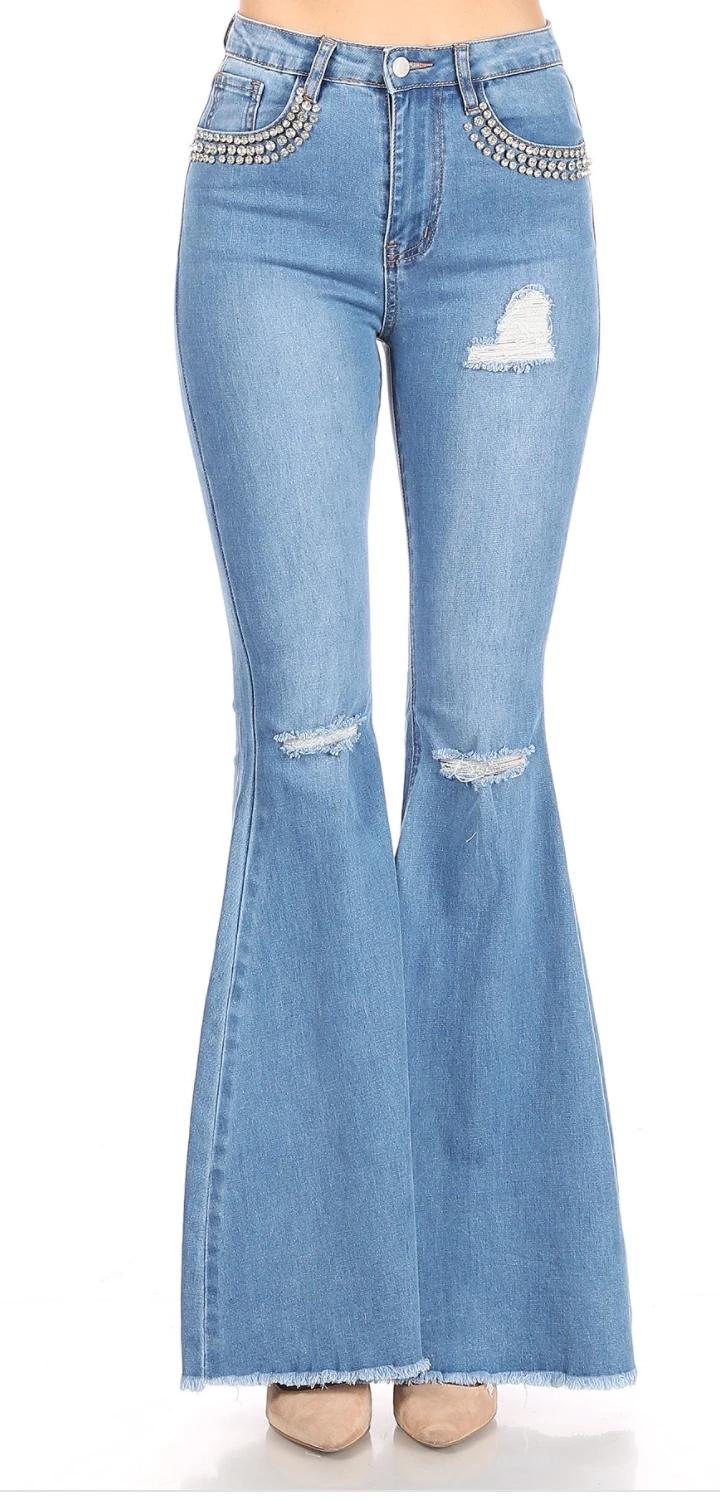 Our Bling It On Bells are the perfect bottoms for any occasion! They feature a flare bottom, light distressing, and some bling around the front pockets. They have working belt loops and pockets, and have great stretch for your comfort!Â