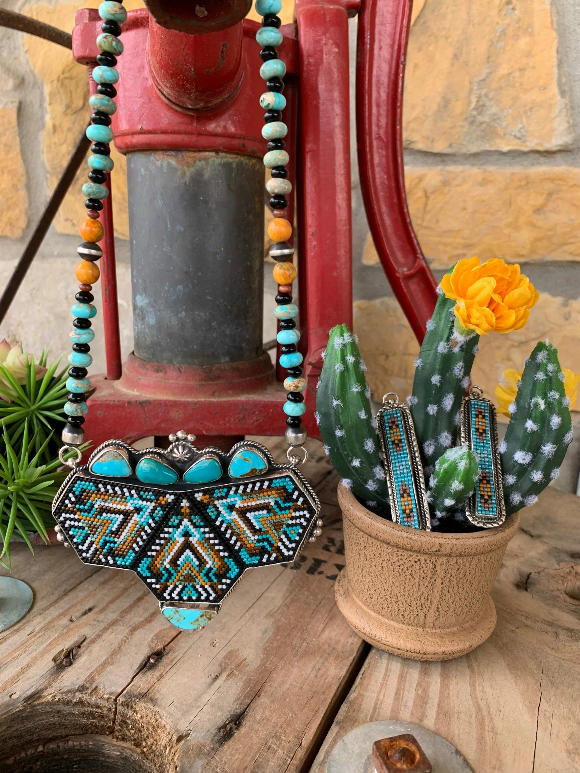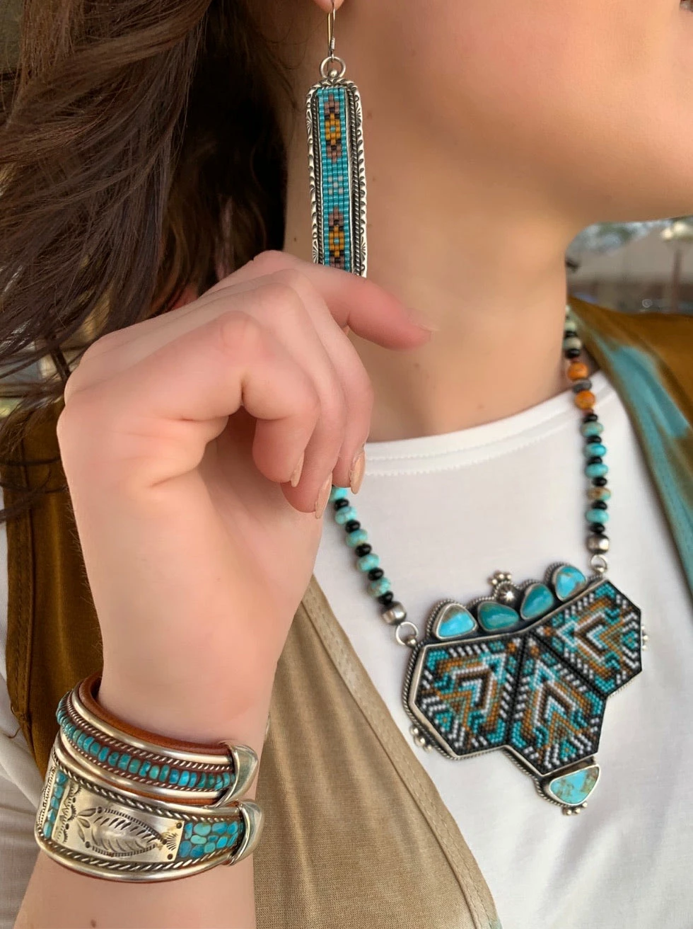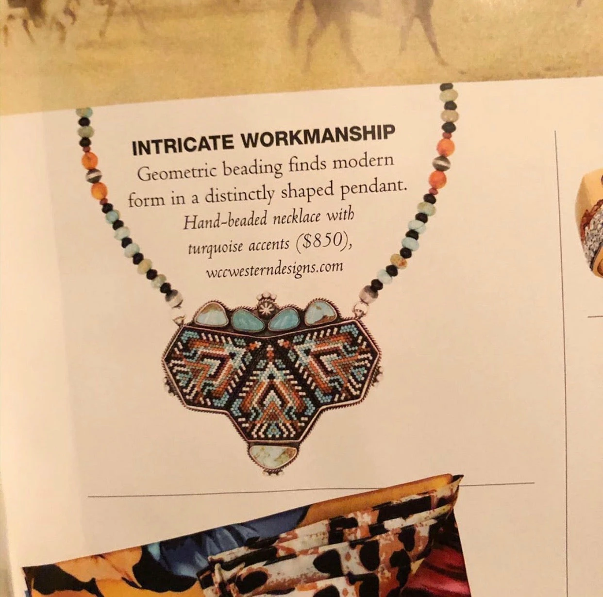 Walker Clampitt of WCC WESTERN DESIGNS creates a most stunning, innovative piece by combining the age old art of beading, with beautifully placed turquoise stone set in sterling silver featuring delicate accents. Â