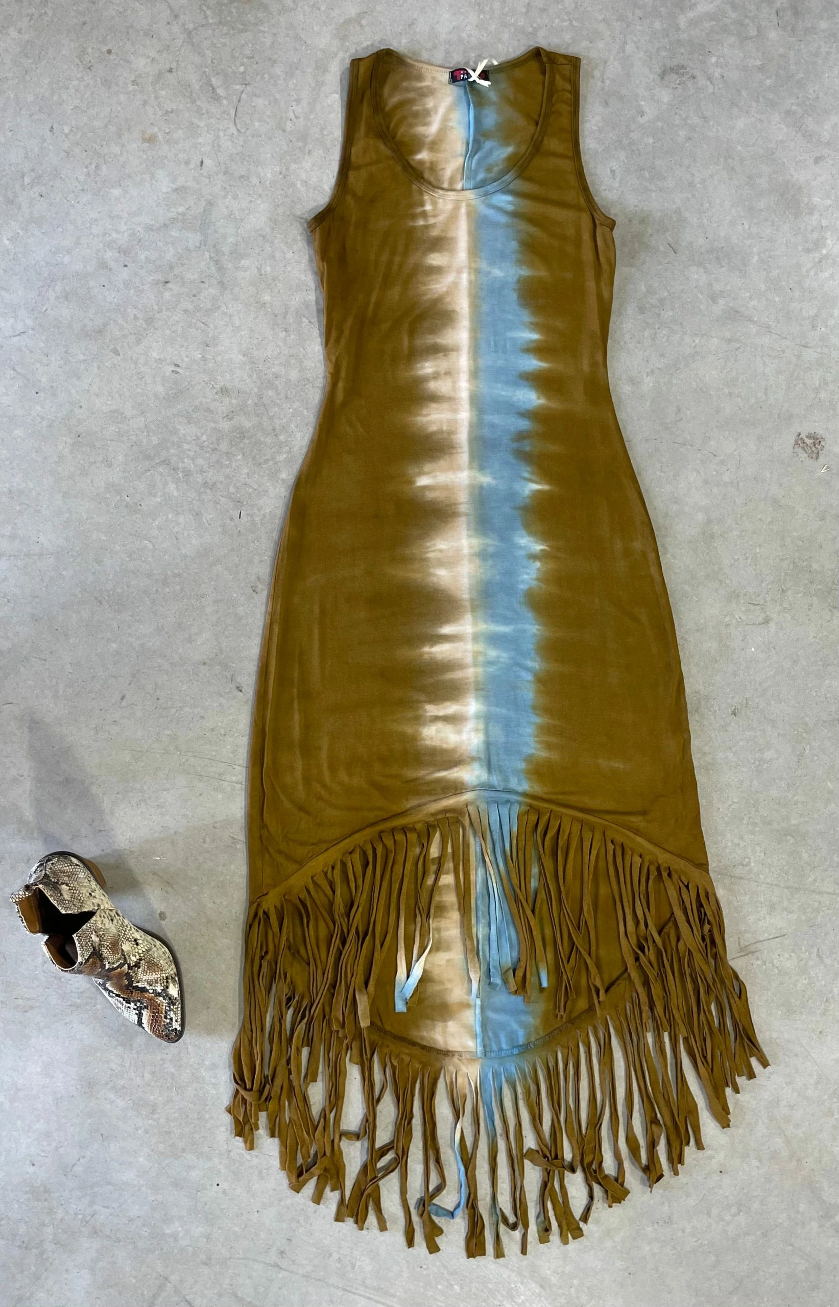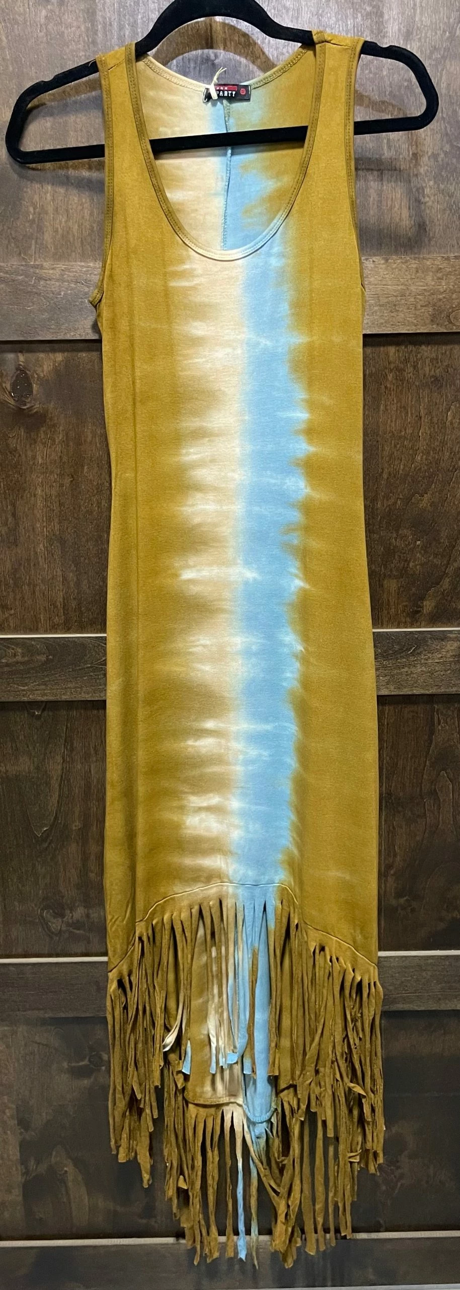The Navajo Princess dress by T-Party is TIE DYE for! Super soft, comfy and stretchy! This dress features a hi cut to front and low to back, fringe to bottom, sleeveless and vertical tie dye center. So beautiful! 95% Viscous and 5% Spandex.
