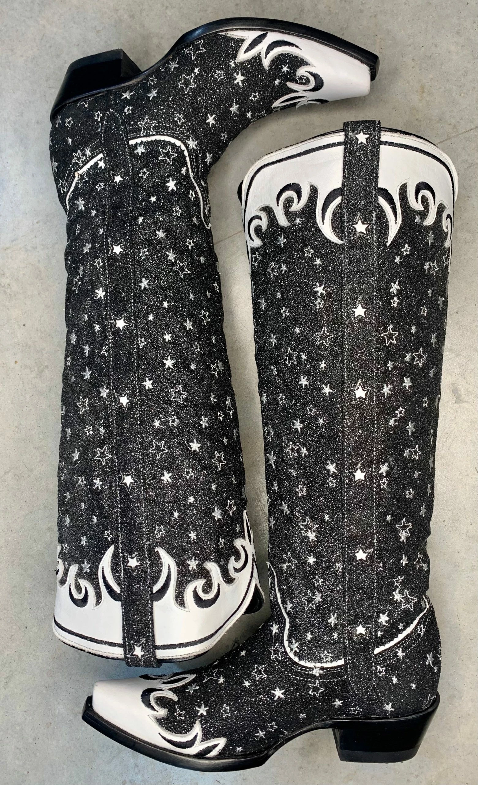 - Oh my STARS! Have you ever seen anything so gorgeous! These new beauties from Old Gringo are nothing short of perfection. They are black with white stars and white design across the top and across the toe. The glitter throughout makes them shine like the sky!!Â