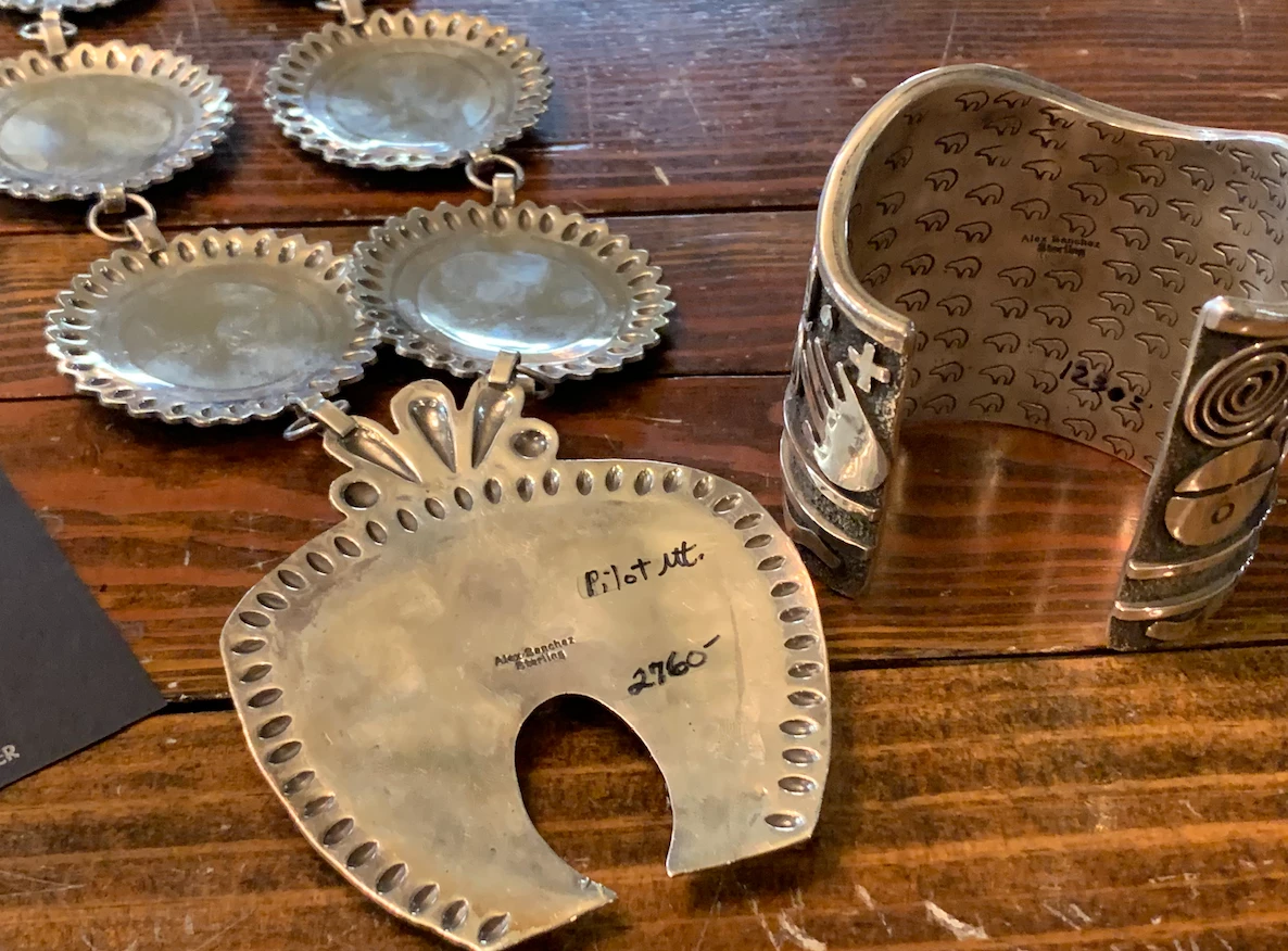 Alex Sanchez’ technique is a wonderful blend of contemporary and traditional styles. Alex works in heavy gauge sterling and 14K gold. He chooses his stones carefully and works them into his petroglyph patterns. Alex has developed a flair for unique combinations of design and color. He was inspired by his brother (Myron Panteah,) in his 20’s while studying Sports Medicine at Fort Lewis College in Durango, Colorado.