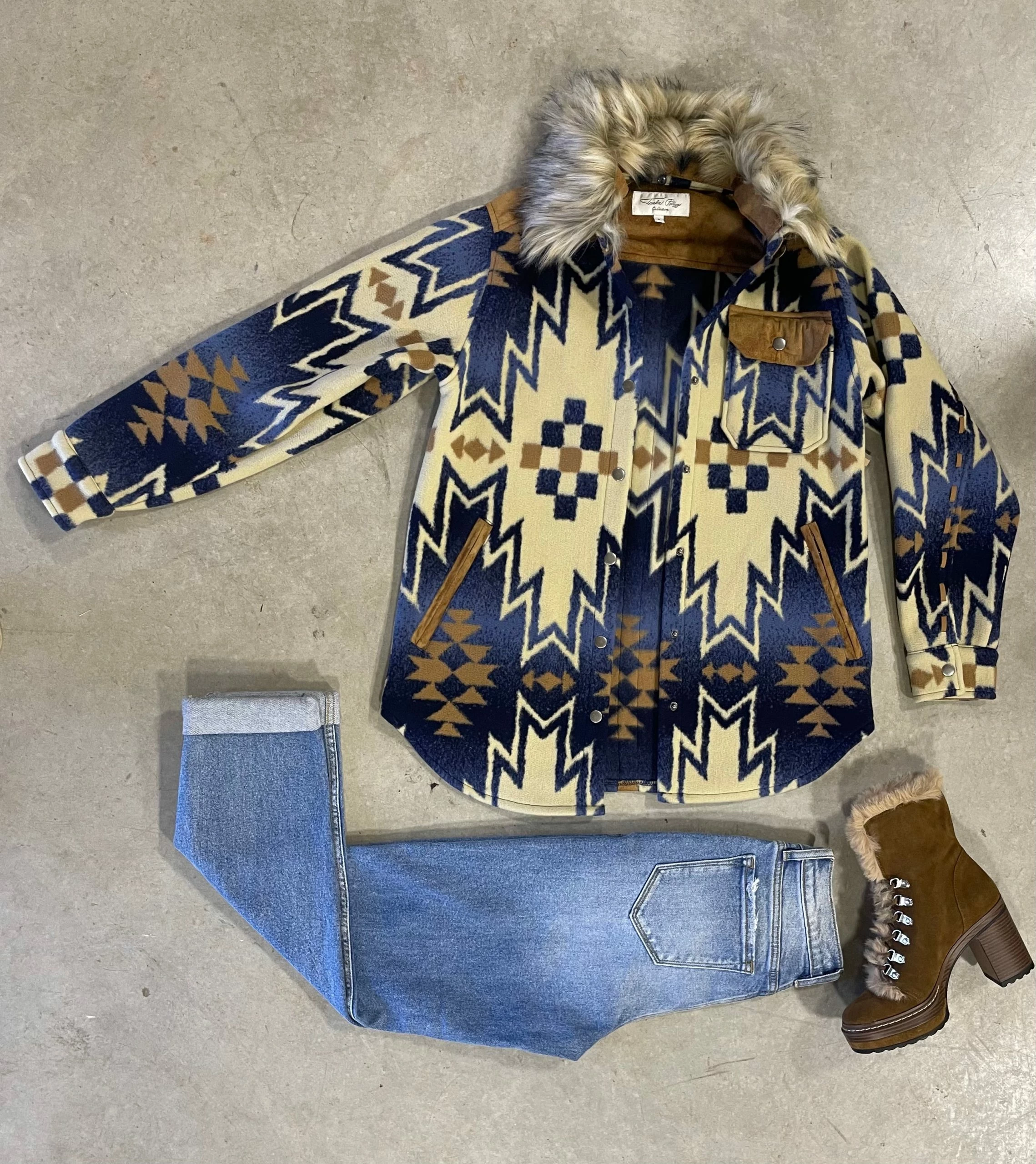 We are soooo ready to bundle up in this cozy jacket by Tosha Polizzi! Jacket features an easy removable faux fur collar, snap front closure, zipper pockets to front, snap pocket to left chest, suede across back shoulders and to whip stitching down back of sleeves. Cozy up in style!