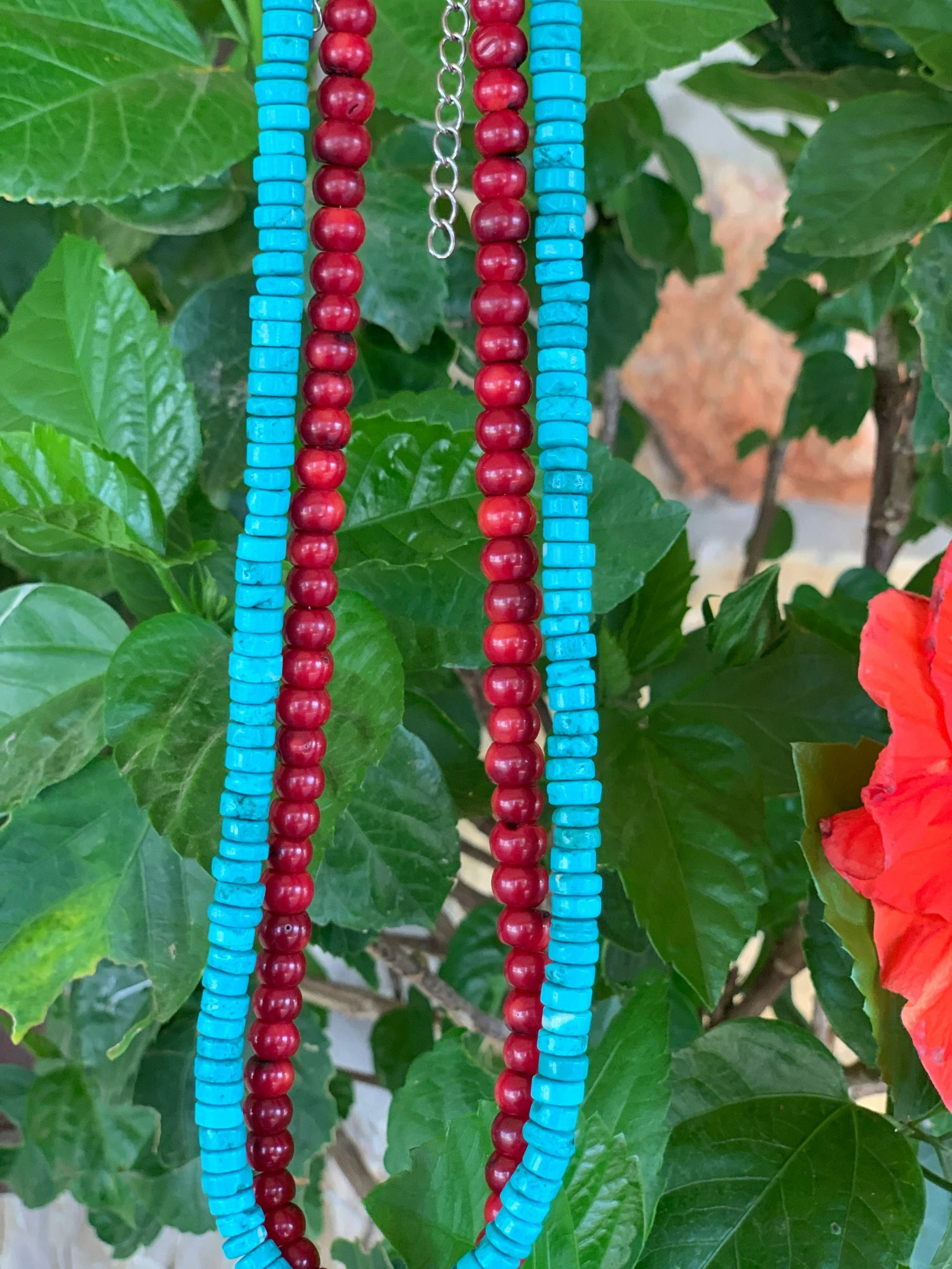 This fun necklace features authentic red coral in a circular cut. The various colors in each piece offers so many different styling options!