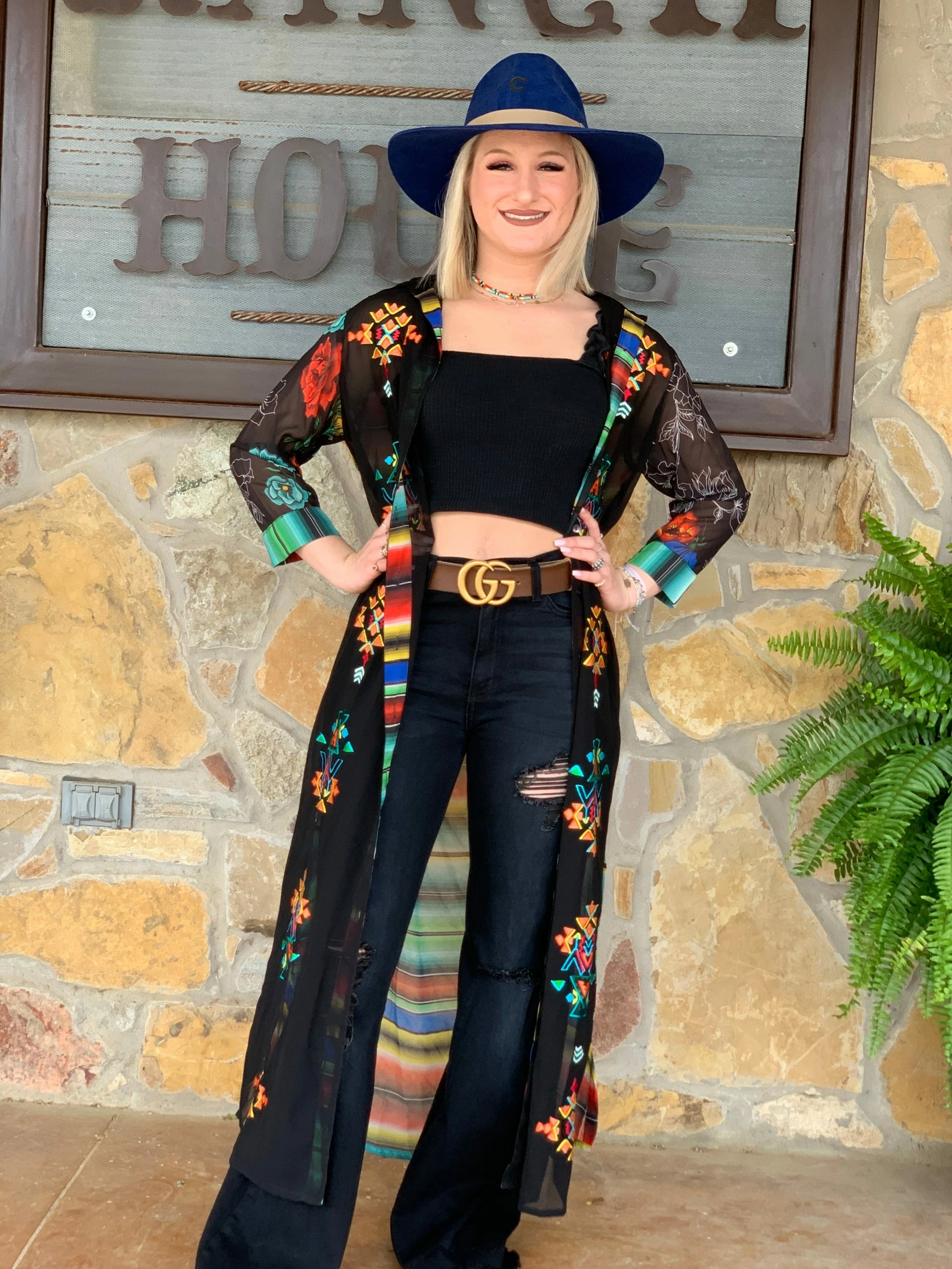 This sheer long duster is great to give you a little spice i your step! Its brightly colored sarape back and floral sleeves, with a touch of embroidery is gorgeous on the eyes! Hand women and made with love!
