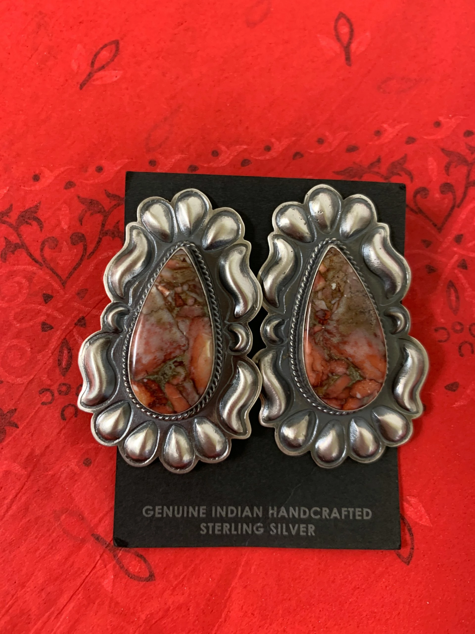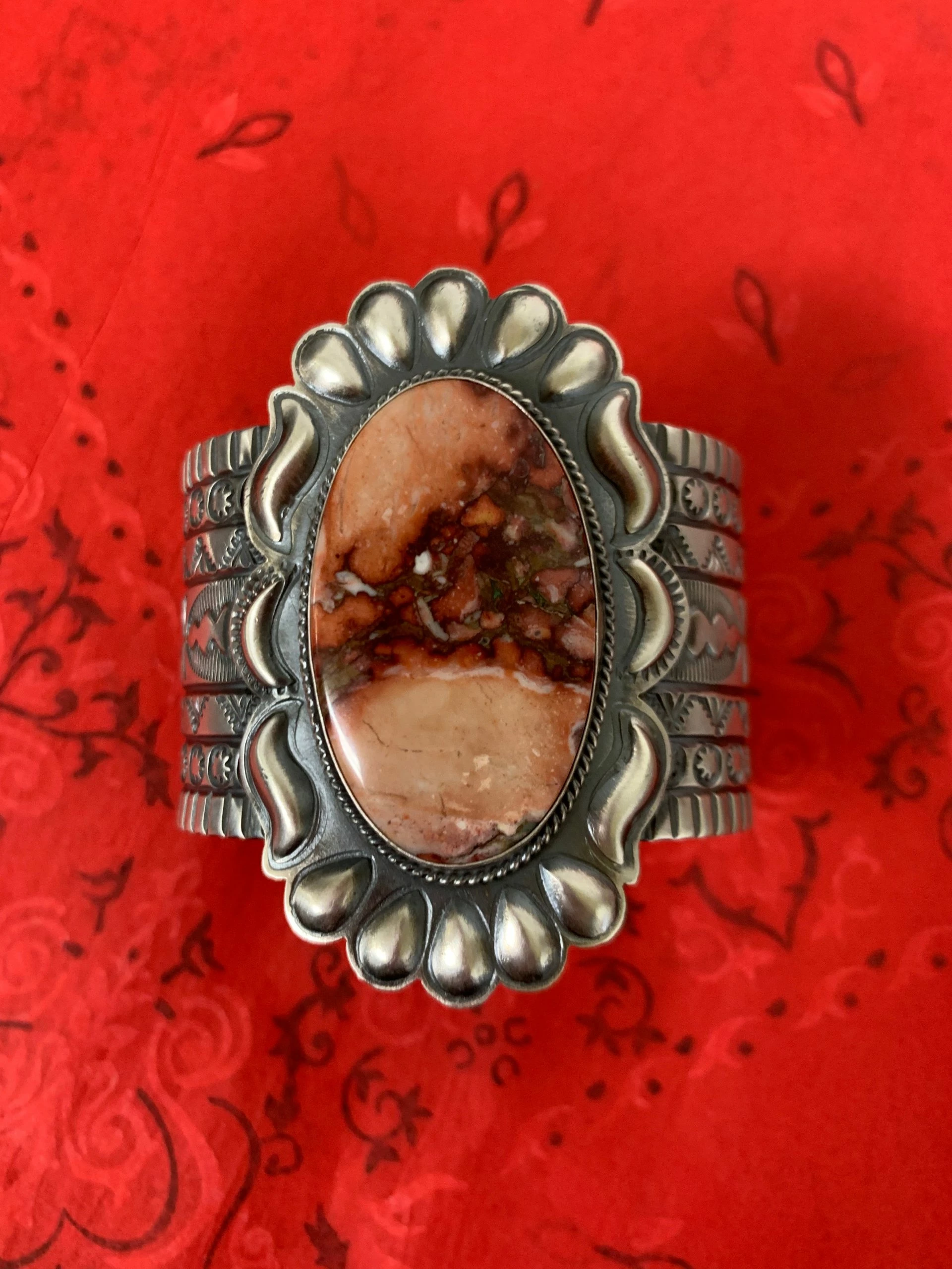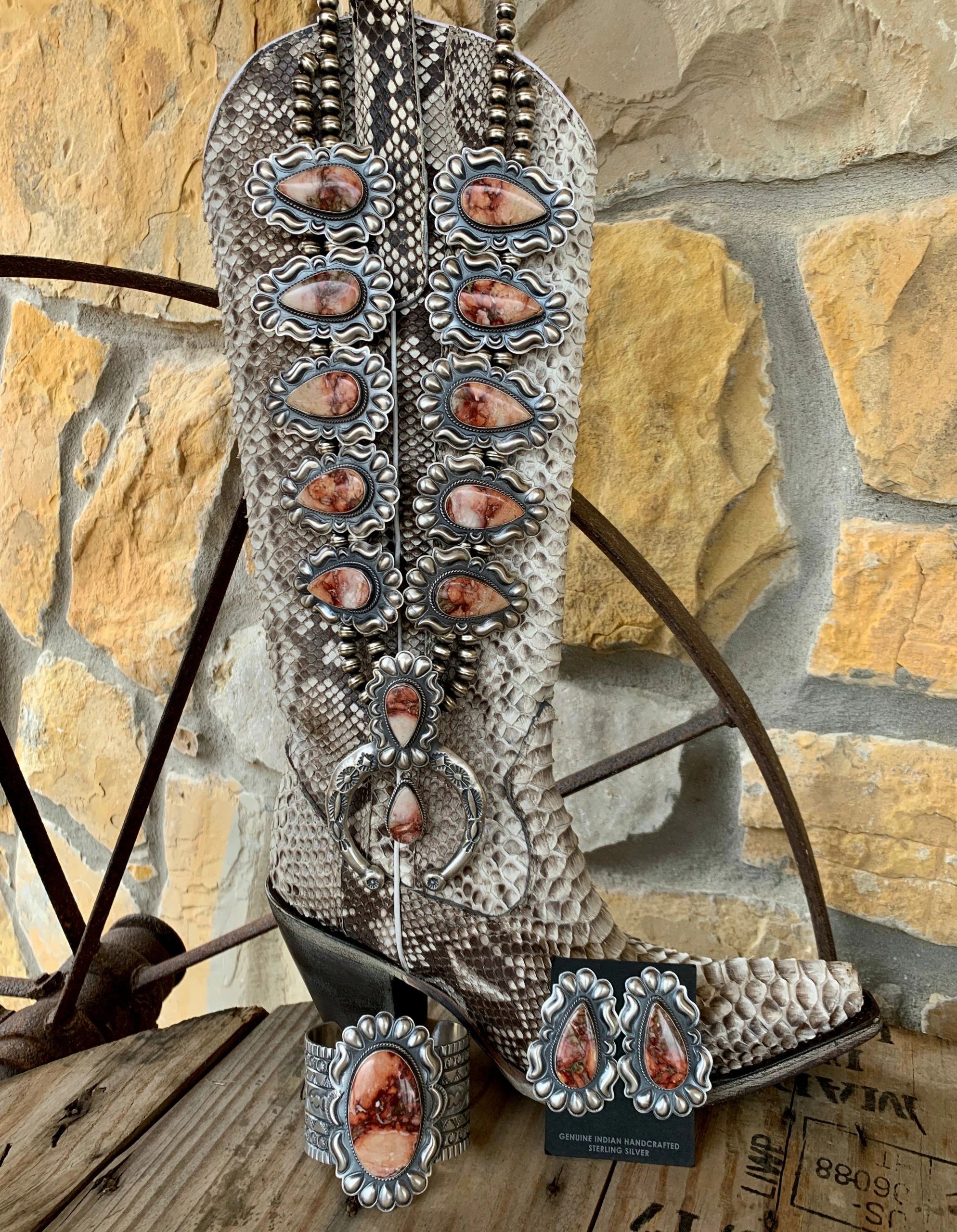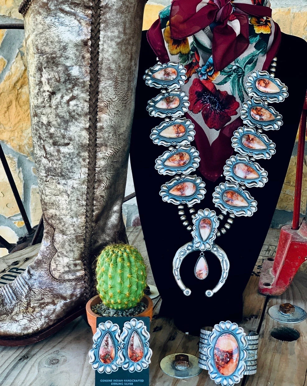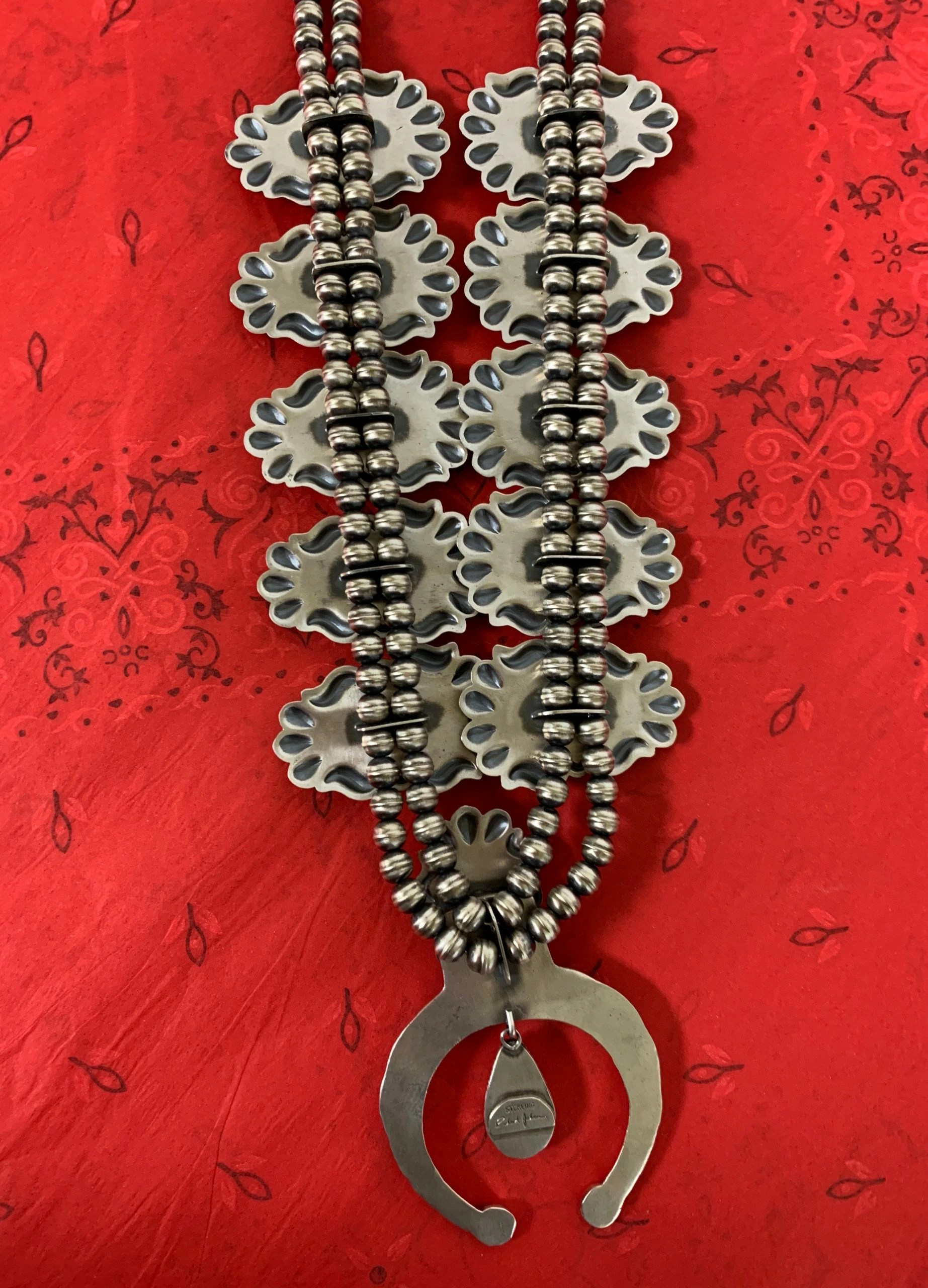 •We took 12 exquisite Red Jasper stones and surrounded them with one-of-a-kind sterling silver designs to create this stunning squash necklace. Squash measures 17.5” inches from tip of Naja to top Navajo Pearl.