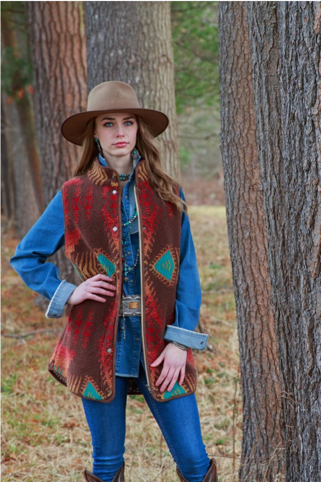 This western vest is sure to keep you warm all winter long! Its long length and soft, plushy fabric are perfect as a statement outerwear piece when the temperature drops! The shell is 70% polyester and 30% acrylic, while the trim and lining are 100% polyester.