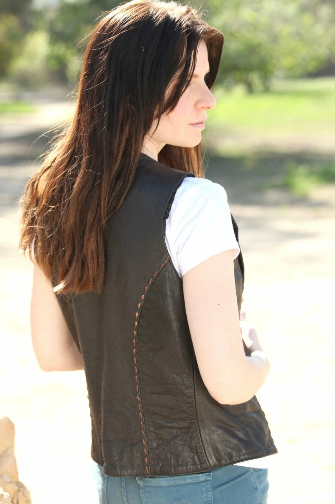 It is satin lined with two hand tooled pockets in front and the Collars are also hand tooled.It has 4 brass concho`s in front and is twisted hand laced in front and back a must for a western outdoors girl.